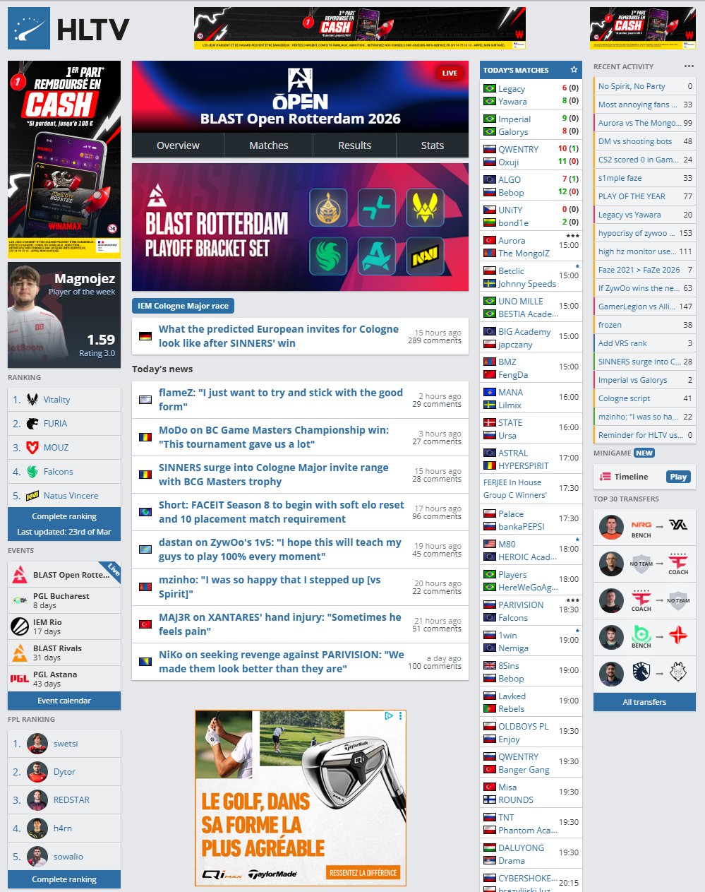 HLTV is a CS2 statistics database and news platform. With over 46 million monthly visitors it's the largest site in the Counter-Strike ecosystem, and that is so for good reason. The depth of data is genuinely impressive.